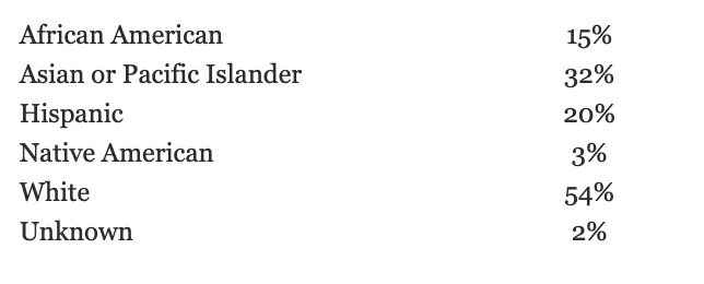 컬럼비아는 여전히 미국에서 가장 진보적인 캠퍼스 중 하나로 남아 있다. 이를 증명해 주는 것 중의 하나가 아이비리그에서 유색인종 학생들의 비율이 가장 높은 캠퍼스이다. 학부생의 12퍼센트는 아프리카계 미국인이고, 20퍼센트는 히스패닉계이고, 32퍼센트는 아시아계 미국인이고, 2퍼센트는 다민족이다. 아래의 표는 미국 내 (Domestic-US Citizens and Permanent Residents)