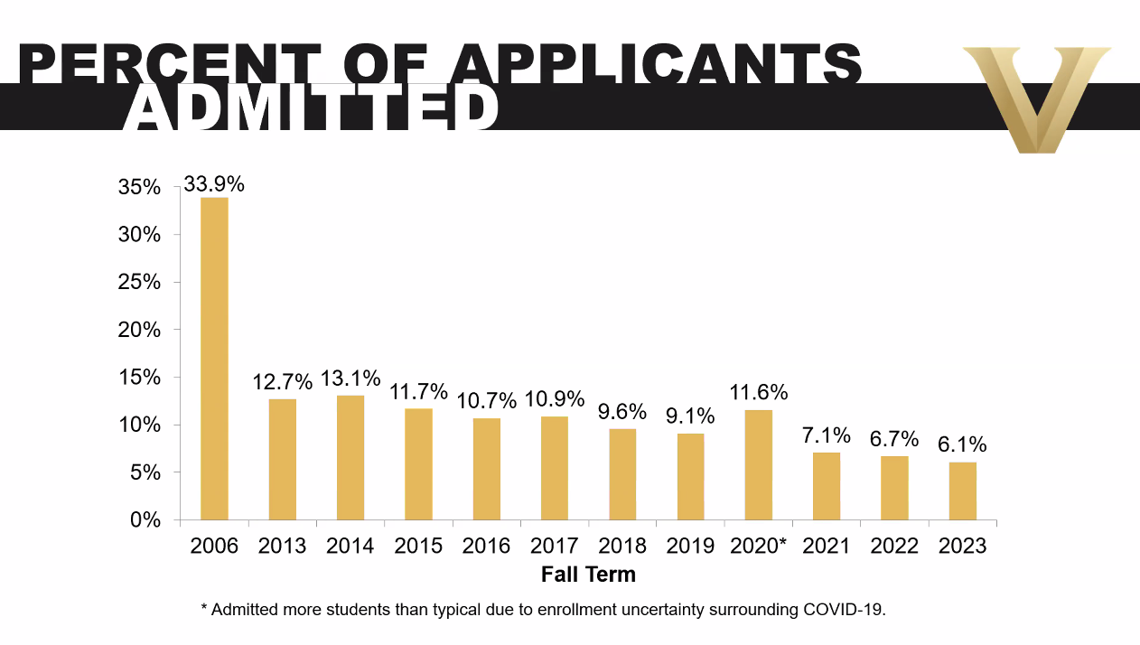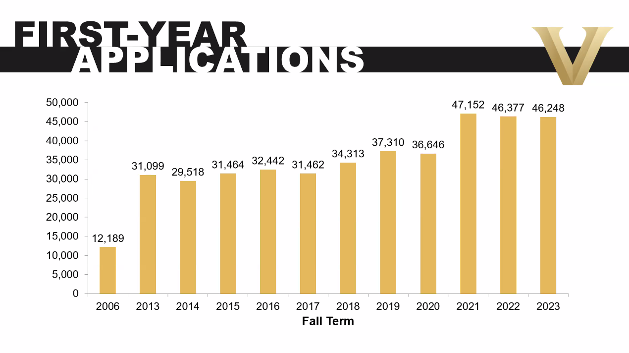 2023년도에는 46,248명이 지원했고, 이 중 6.1%만이 합격했다. 이는 밴더빌트 대학이 매우 경쟁력 있는 입학 과정을 유지하고 있음을 보여주며, 학문적으로 우수한 학생들만이 입학할 수 있는 학교로 자리매김하고 있다.