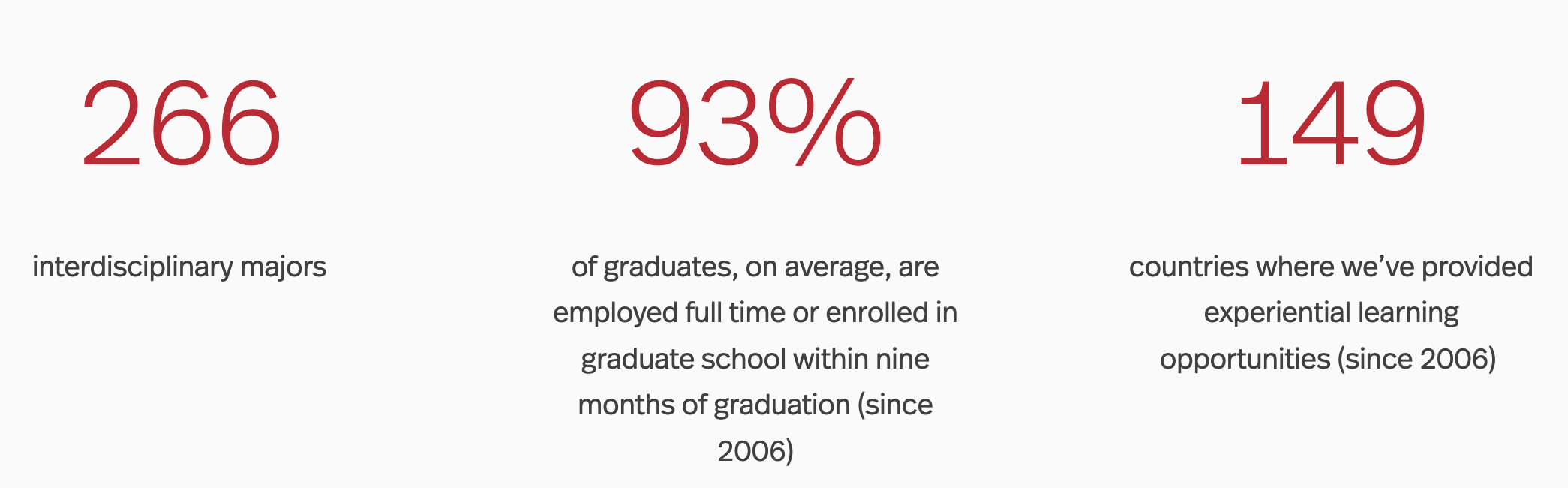 노스이스턴 대학교는 프로그램에서 325개 이상의 전공을 제공하며, 190개 이상의 복합 전공을 통해 학생들이 자신만의 학습 경로를 만들 수 있는 무한한 기회를 제공한다. 다양한 분야에 관심이 있는 학생들은 정보과학 (Information Science)과 인지심리학 (Cognitive Psychology), 정치학 (Political Science)과 커뮤니케이션학 (Communication Studies), 국제관계학 (International Affairs)과 문화인류학 (Cultural Anthropology) 등 여러 전공을 연결하는 학제간 연구를 선택할 수 있다.