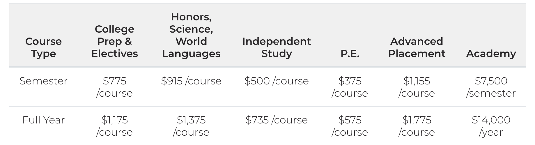 9학년부터 12학년까지의 Upper School의 학생들은 로럴 스프링스에서 정규 등록을 하고 정규 졸업장을 받을 수도 있고, 파트타임으로 등록하여 현재의 학점인정만을 받을 수도 있다. 정규 등록 비용은 선택한 수업과 학생이 있는 과정에 따라 다르다. 아래의 표는 Upper School의 과목별 학비를 자세히 나타낸다.