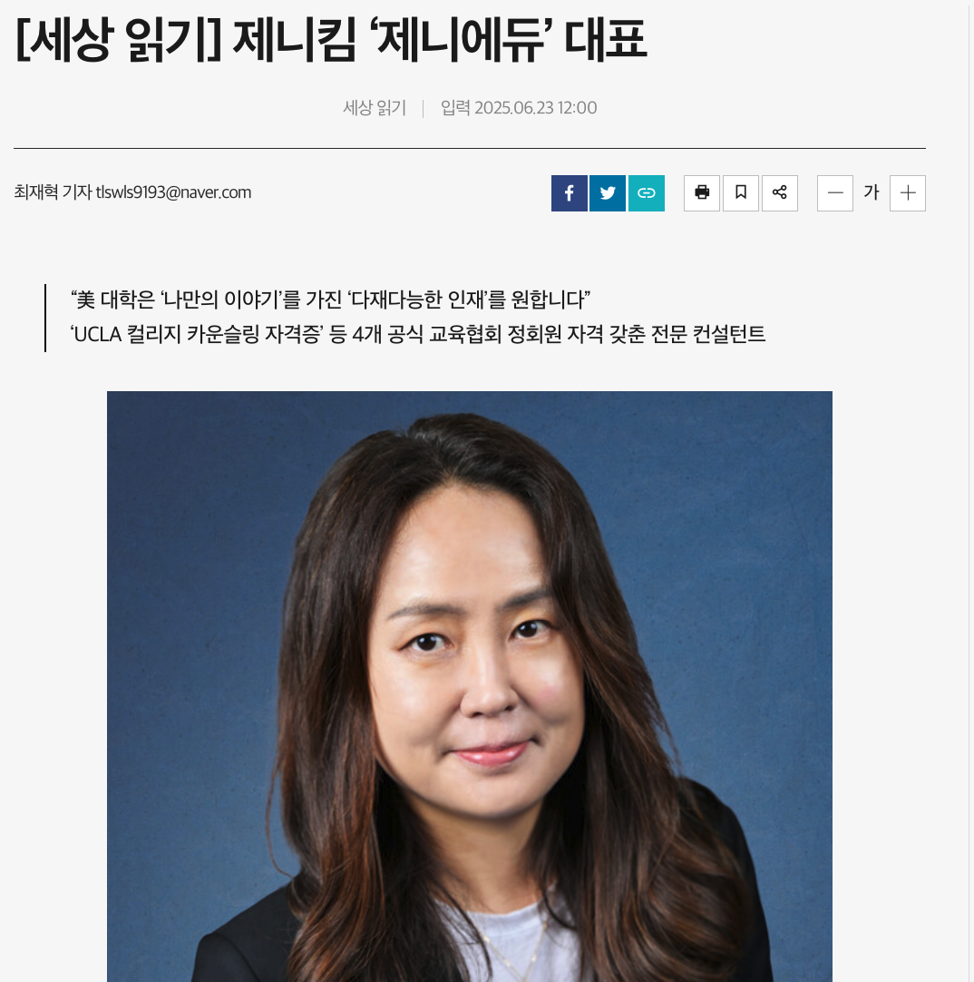 이번 CEO 저널 인터뷰가 특별한 이유는 미국 현지에서 입시 사정관들과 직접 네트워킹하며 얻은 살아있는 정보와 12년 동안 컨설팅 해 온 노하우를 바탕으로 2025년 입시 변화를 분석했기 때문이에요.