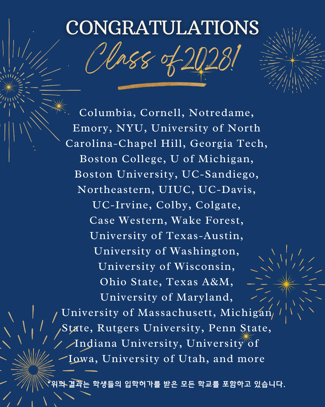 2024년 미국 대학 입시에서 제니에듀는 학생들의 드림스쿨에서 합격의 영광을 누릴 수 있도록 열과 성의를 다하였습니다.
